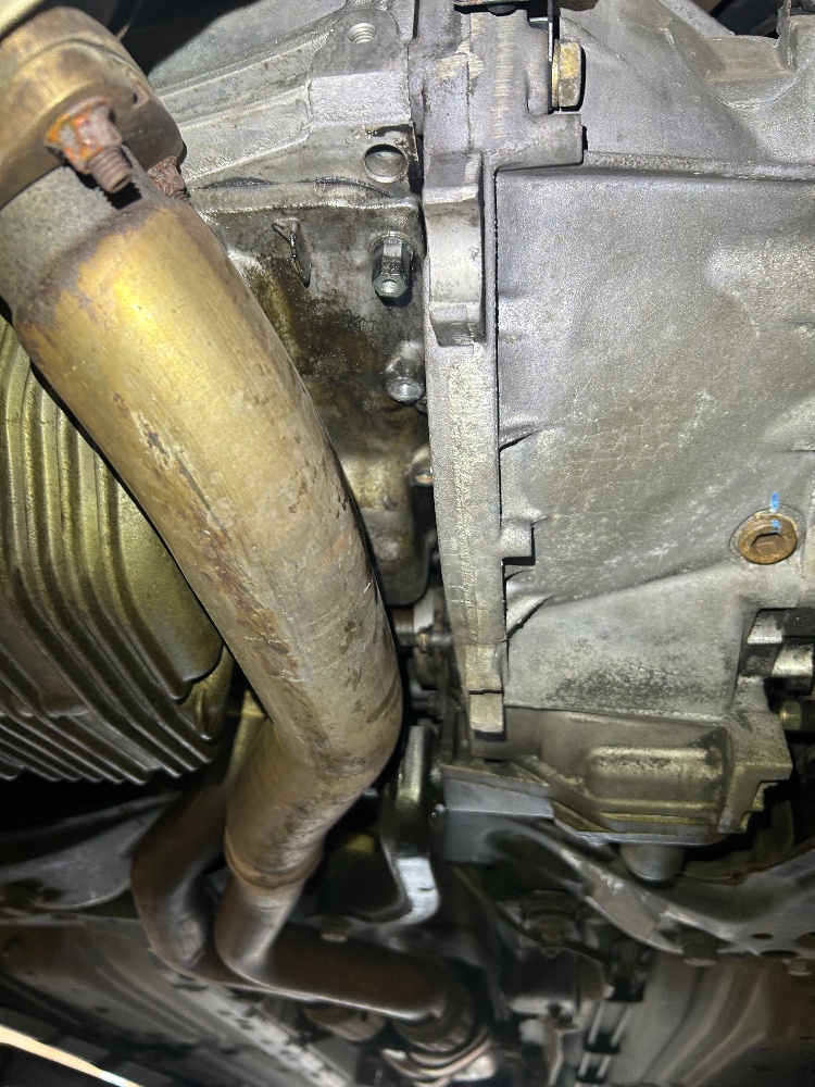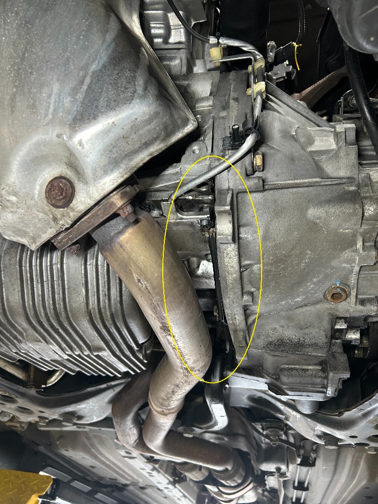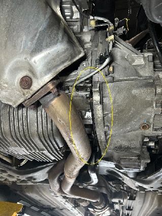 クランク角センサーはミッションの回転部に付いています、マフラーの近くなので冷めてから作業した方が良いですね